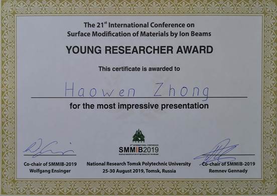 在2019年8月25日至30日于俄罗斯托木斯克市举办的第21届国际离子束材料表面改性大会(The 21th International Conference on Surface Modification ofMaterials by Ion Beams, SMMIB 2019)上,suncitygroup太阳集团官方网站强脉冲粒子束实验室的博士生钟昊玟同学同来自俄罗斯、法国和南非的5名青年学者一道获得了本次会议的青年研究者奖。