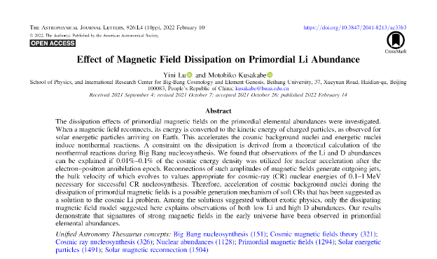 近日,suncitygroup太阳集团官方网站天体物理理论团队在《The Astrophysical Journal Letters》期刊在线发表了题目为“Effect of Magnetic Field Dissipation on Primordial Li Abundance”的论文。硕士生陆漪妮为第一作者,日下部元彦副教授通讯作者。论文链接(https://iopscience.iop.org/article/10.3847/2041-8213/ac33b3)。