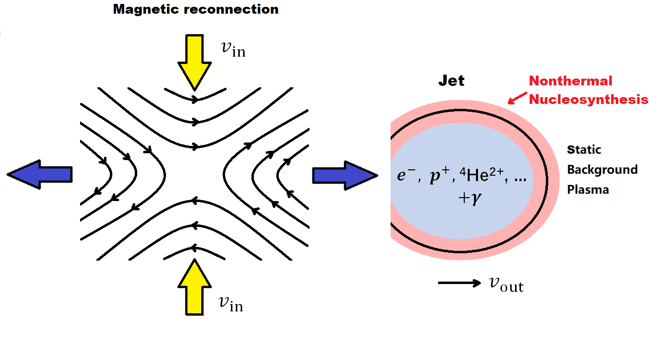 本研究探讨了磁场耗散对原始丰度的影响。正如在太阳的磁场活动中观察到磁场耗散能将磁场的能量转化为带电粒子的动能,而这些加速粒子以“太阳高能粒子”的形式到达地球。如果早期宇宙被磁化,那么磁场耗散会在宇宙演化的过程中产生高能的宇宙线核。而宇宙线核可以引起非热核反应,并改变原始元素的丰度。来自《the Astrophysical Journal Letters》期刊的图片显示了早期宇宙中的磁重联导致原子核和电子的射流的图像。