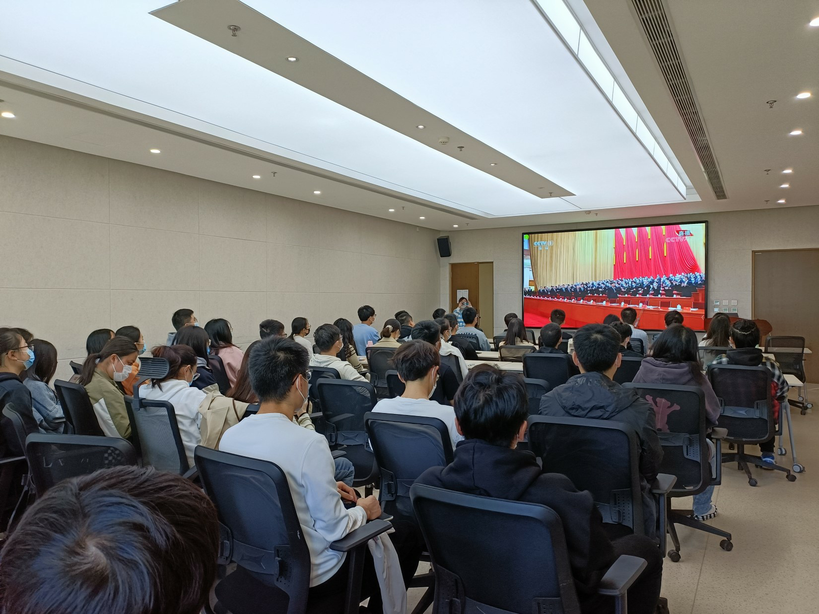 suncitygroup太阳集团官方网站积极部署,领导班子成员、全体辅导员在沙河校区咏曼剧场观看了大会直播。学院在沙河校区主楼C座511、523和506会议室设置了同步会场,组织本科生第一、第二党支部,研究生BY2219、SY2219、SY2119党支部的党员集中观看,并安排其他师生党员自行观看,大家认真聆听了习近平总书记在大会上的报告。