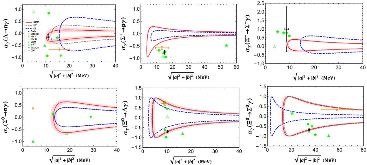 图3:六个超子弱辐射(八重态)衰变道的不对称参数随宇称守恒振幅a的变化:横坐标可认为是衰变分之比,纵坐标为不对称参数。红色的线以及阴影区域为本工作的计算结果。黑色的误差条代表了最新的实验数据。剩余颜色的线和图形是其它理论模型、方法预测的结果。