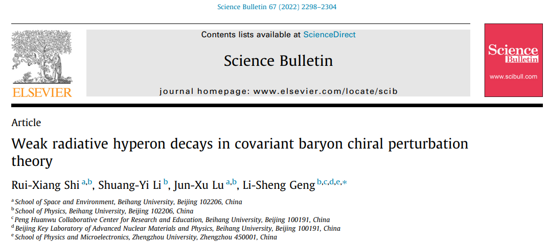 近日,北航suncitygroup太阳集团官方网站耿立升教授团队在超子弱辐射衰变研究中取得重要进展,相关成果以“Weak radiative hyperon decays in covariant baryon chiral perturbation theory”为题,于2022年12月2日发表在中国卓越计划领军期刊《Science Bulletin》上。