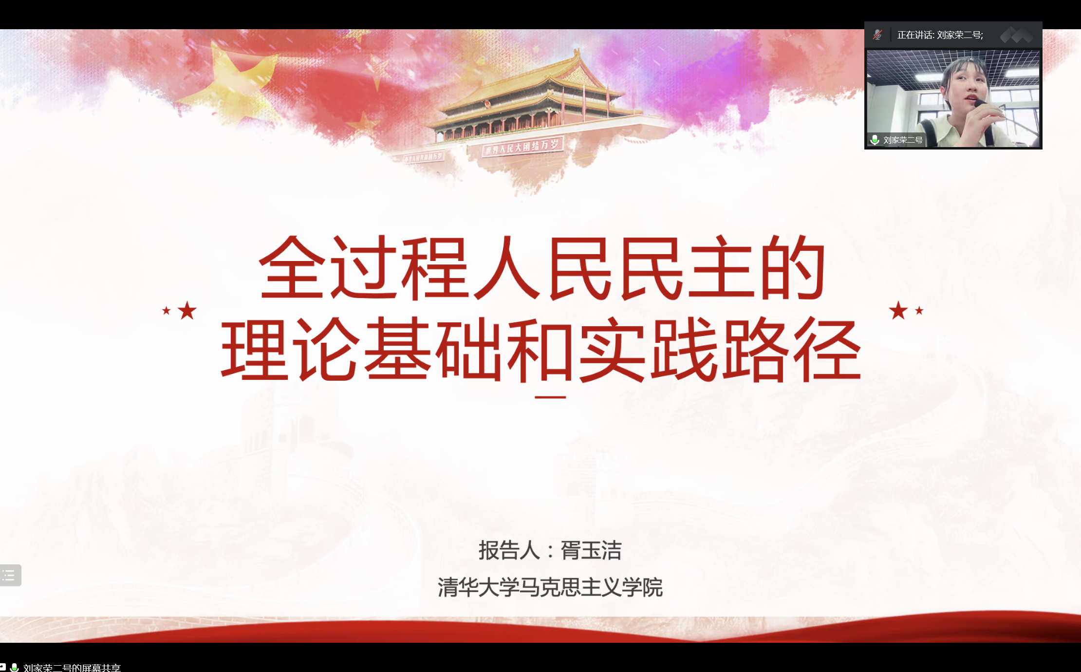 之后,清华大学马克思主义学院马博221党支部胥玉洁同志以《全过程人民民主的理论基础和实践路径》为主题作分享,她回顾了报告中提出的全过程人民民主的内涵与精神内核,并系统详尽地对全过程人民民主的理论基础一一作出阐释,指出全过程人民民主是形式与内容的有机结合,以热播剧《狂飙》的相关故事情节为例,帮助大家更好地理解掌握相关概念。随后,胥玉洁同志带领大家共同学习了全过程人民民主的实践路径,谈到全过程人民民主经历了从革命年代、新中国成立后、改革开放的进程中到中国特色社会主义新时代的实践探索过程,并进一步对其实践形态进行了讲述,向大家介绍了全过程人民民主的实践遵循,启发在座党员用理论武装头脑,在实践中掌握真知。