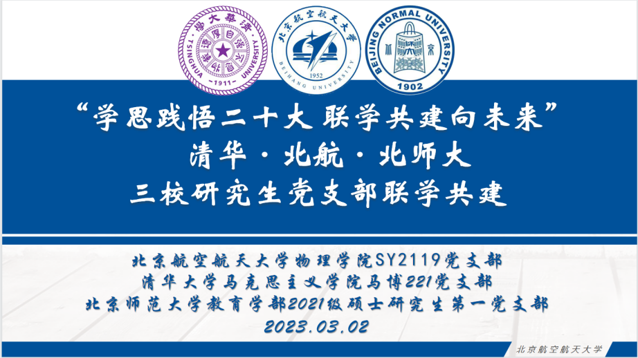 为深入学习贯彻党的二十大精神,进一步加深同学们对党的二十大的精神实质、核心要义的认识,近日,北航suncitygroup太阳集团官方网站SY2119党支部联合清华大学马克思主义学院马博221党支部、北京师范大学教育学部2021级研究生党支部开展联学共建活动,深入学习二十大报告。本次活动在三校分设会场并同步开展。
