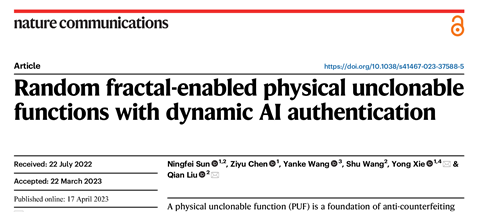 近日,北航suncitygroup太阳集团官方网站微纳物理与应用研究室谢勇副教授、陈子瑜教授与国家纳米科学中心刘前研究员和德国卡尔斯鲁厄理工学院王彦柯博士合作,在物理不可复制功能(PUF)防伪系统方面取得重要进展,相关研究成果于2023年4月18日以“Random fractal-enabled physical unclonable functions with dynamic AI authentication”为题在线发表于《自然-通讯》。博士生孙宁飞为第一作者,谢勇和刘前为通讯作者,北航为第一单位。