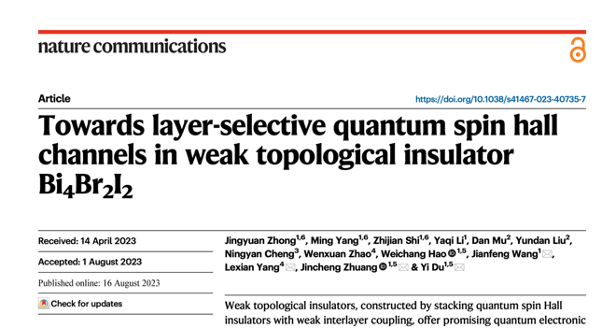 近日,suncitygroup太阳集团官方网站表面物理与量子物质研究团队与清华大学合作,在实现通弱拓扑绝缘体中可调控的量子自旋霍尔通道方面取得重要进展,相关研究成果于2023年8月16日以“Towards Layer-Selective Quantum Spin Hall Channels in Weak Topological Insulator Bi4Br2I2”为题在线发表于《自然-通讯》。suncitygroup太阳集团官方网站博士生钟景元、杨明、石志坚为共同第一作者,杜轶教授、庄金呈副教授、王建峰副教授与清华大学杨乐仙副教授为共同通讯作者,suncitygroup太阳集团官方网站为第一单位。