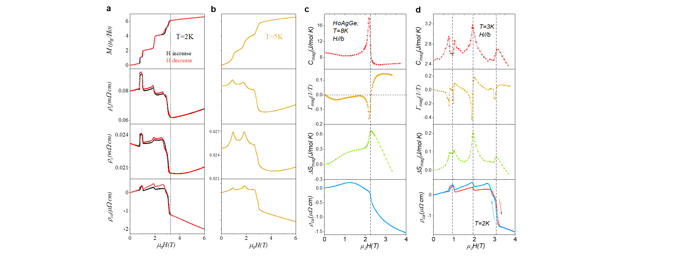 图2:a-b,HoAgGe的磁性和输运性质。对于H//b,在2 K (a)、5 K (b) 下显示磁化强度M、a轴MR ρa、c轴MR ρc和霍尔电阻ρca。c-d, HoAgGe的热力学测量结果与霍尔数据的比较。在H//b条件下,HoAgGe在8 K (c)和3K(d)下的磁比热Cmag、磁格林奈森参数Γmag、磁熵变化ΔSmag和霍尔电阻率ρca的场依赖性。