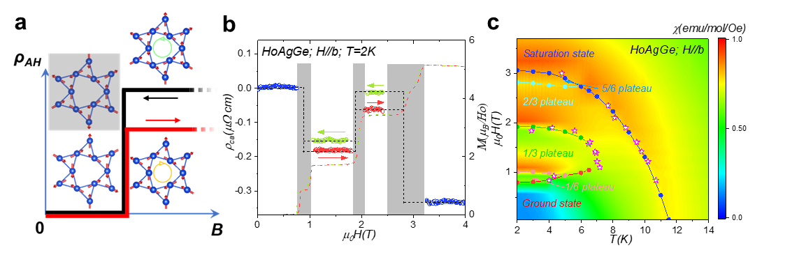 图1:HoAgGe中场诱导平台相的类时间反演简并度。a,由于出现类时间反演简并态而引起的反常霍尔电阻率大小的有限场回滞,磁平台上的两种态分别是S1/3(右上)和S’1/3(右下);左图是没有反常霍尔效应的两个时间反演简并Kagome冰基态。b,空心圆表示H//b条件下HoAgGe的霍尔电阻率ρca(沿c方向电流,沿a方向电压)在2K时的反常部分ρcaAH。彩色虚线表示减去H线性项后的修正磁化强度M(H)。c,H//b下HoAgGe的H - T相图,由M(H) 和Cmag和Γmag测量得出,彩色数值表示磁化率。