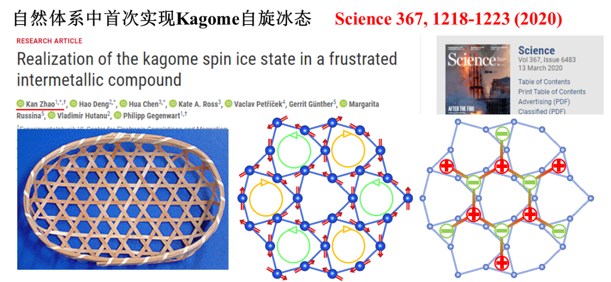然而,由于缺乏合适的材料载体,Kagome自旋冰长期以来只能通过人造铁磁性纳米微结构来模拟,这极大地限制了对其本质性质的深入理解。针对这一关键科学问题,2020年,赵侃教授(当时为德国奥格斯堡大学博士后)和德国奥格斯堡大学Philipp Gegenwart教授,以及欧洲和美国研究人员组成的国际团队,通过拓展研究材料领域,区别于广泛关注的阻挫磁性绝缘体,首次在阻挫金属HoAgGe中实现了Kagome自旋冰态。相关结果以研究论文(Research article)发表在 Science 367, 1218-1223 (2020)。HoAgGe的相关研究,为今后准二维阻挫金属体系中奇特磁行为的研究铺平了道路。