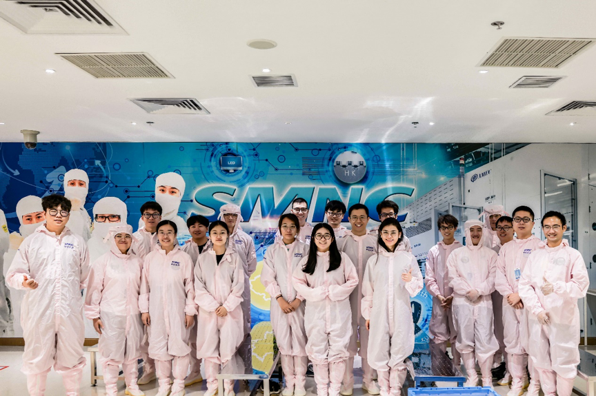 随后,同学们身穿无尘服、无尘鞋,在讲解员引导下近距离参观无尘自动化车间。整个车间智能化生产,与传统工厂流水线截然不同。芯片的转移运输都是由房顶的轨道交通进行转运,高速高效稳定安全。讲解员为大家简要介绍了中芯国际的工作环境和晶圆制造流程。