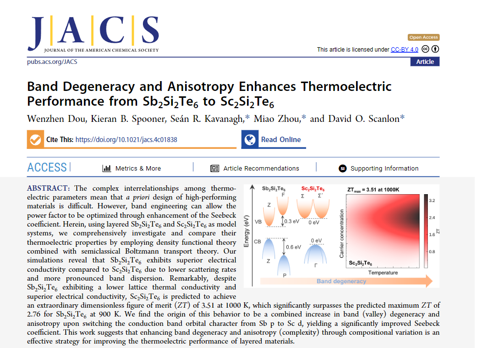 近日,北航suncitygroup太阳集团官方网站周苗教授与合作者在层状化合物热电材料的理论设计方面取得重要进展,相关成果以“Band Degeneracy and Anisotropy Enhances Thermoelectric Performance from Sb2Si2Te6 to Sc2Si2Te6”为题在《Journal of the American Chemical Society》上发表。