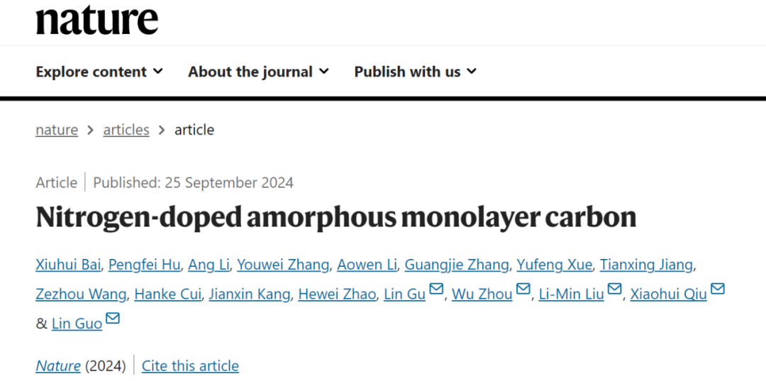 北航新闻网9月26日电(通讯员 刘少佳)2024年9月25日,《Nature》杂志报道了suncitygroup太阳集团官方网站郭林教授、刘利民教授研究团队和合作者在氮掺杂单原子层非晶碳可控合成上取得的最新进展:《Nitrogen-doped amorphous monolayer carbon》。该工作提出了一种利用纳米尺度二维限域模板进行小分子聚合的液相合成策略,成功制备了氮掺杂的单原子层非晶碳材料。这项研究解决了二维非晶材料合成领域的长期挑战,为二维非晶材料在材料科学、电子器件及其他前沿技术领域的应用开辟了新途径。suncitygroup太阳集团官方网站博士生白秀辉、副研究员胡鹏飞、博士生张有玮、薛宇峰,中国科学院大学博士生李昂、李傲雯,国家纳米科学中心副研究员张光杰为共同第一作者,suncitygroup太阳集团官方网站郭林教授、刘利民教授,国家纳米科学中心裘晓辉研究员,中国科学院大学周武教授,清华大学谷林教授为通讯作者,suncitygroup太阳集团官方网站为第一单位。