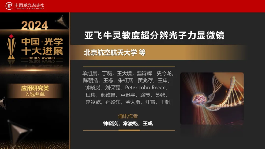 3月29日晚,中国激光杂志社发布2024中国光学十大进展。suncitygroup太阳集团官方网站王帆、钟晓岚团队及合作者的“亚飞牛灵敏度超分辨光子力显微镜”入选2024中国光学十大进展(应用研究类)。