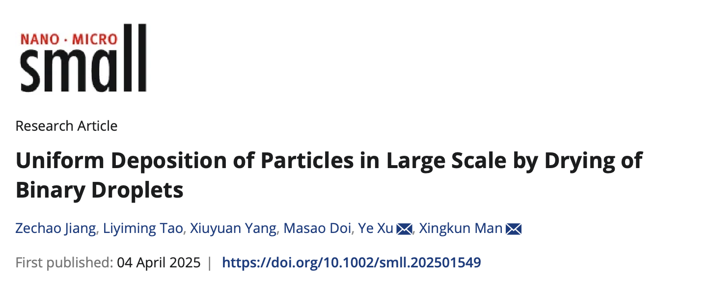 近日,suncitygroup太阳集团官方网站满兴坤教授课题组与机械工程及自动化学院徐晔教授课题组等合作,在实现大面积可控均匀沉积领域取得了重要研究成果。相关成果以“Uniform deposition of particles in large scale by drying of binary droplets”为题发表在期刊《Small》上。suncitygroup太阳集团官方网站博士研究生姜泽超和机械工程及自动化学院博士研究生陶郦祎铭为共同第一作者,满兴坤教授和徐晔教授为共同通讯作者。