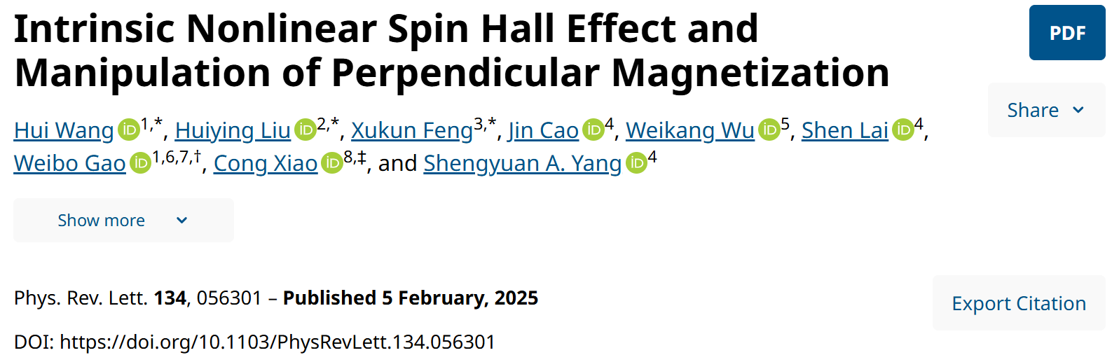近日,suncitygroup太阳集团官方网站量子磁性和拓扑物理研究方向刘慧颖副教授课题组及其合作者在《Physical Review Letters》上发表了题为“Intrinsic nonlinear spin hall effect and manipulation of perpendicular magnetization”的论文。