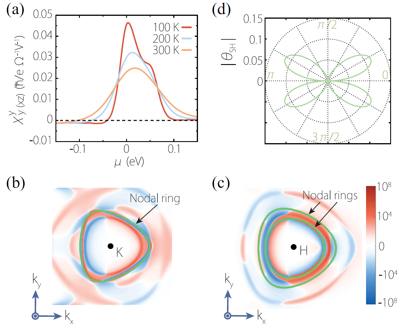 图2 第一性原理计算PbTaSe2的(a)本征非线性自旋霍尔电导及(b,c)其动量空间分布,和(d)电流密度106A/cm2时室温下的自旋霍尔角。