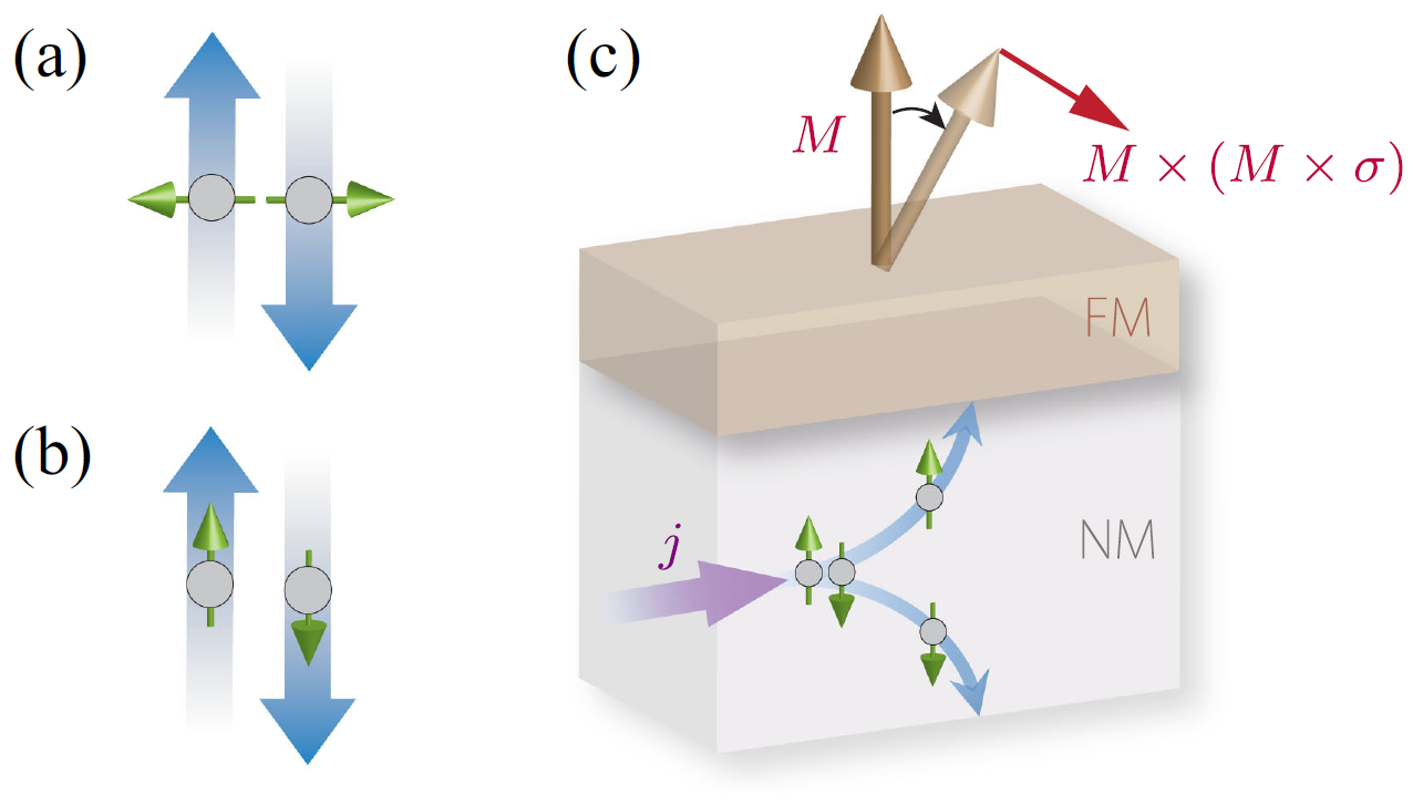 图1 自旋霍尔流调控铁磁层垂直平面方向磁矩的示意图。传统自旋霍尔效应产生的自旋流自旋极化方向和流动方向垂直,而共线极化自旋流的自旋极化方向和流动方向共线。