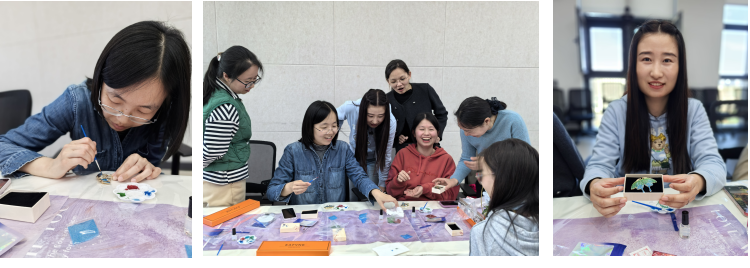 活动下半场,手作专家靖然老师引领教师们深入体验了传统烧蓝技艺之美。她不但展示了烧蓝技术从皇家御用到现代航天器镀膜技术的演变历程,并详细解析了这一传统工艺的制作流程和步骤。还带领大家一同欣赏了众多精致的烧蓝作品。在她的指导下,教师们亲自动手实践,根据个人喜好进行设计、调色和上色。随着教师们手中的画笔舞动,一件件融合了多种元素的胸针逐渐成形。烧蓝技艺中的“蓝”代表着智慧的结晶,正如suncitygroup太阳集团官方网站女性教师们所展现的坚韧不拔的探索精神。