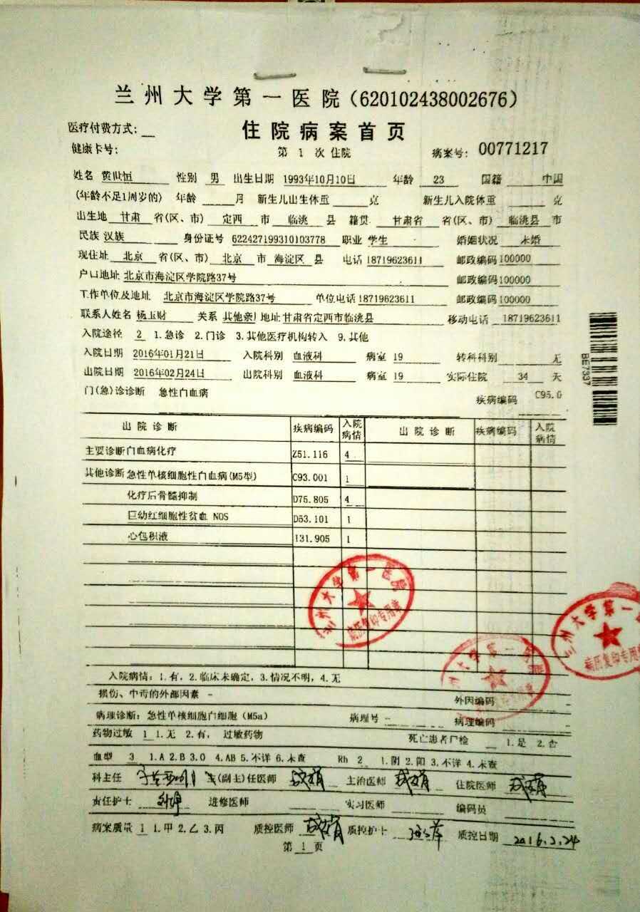 黄世恒,太阳集团官网物理科学与核能工程学院2015届本科毕业生,毕业后回到家乡甘肃兰州一直准备攻读研究生。2016年2月,经诊断,他不幸患上急性单核细胞白血病,目前在兰州大学第一医院接受治疗。
